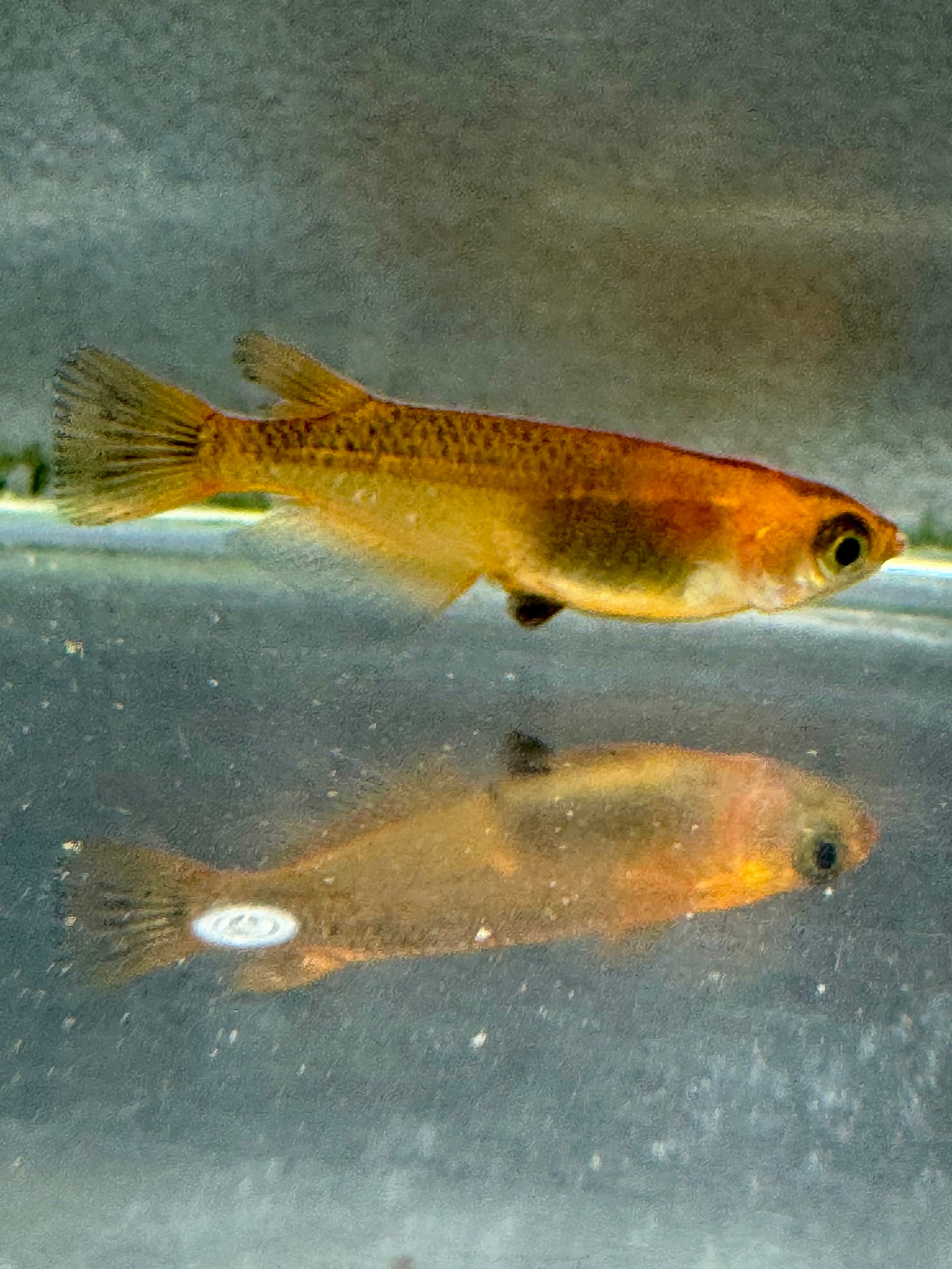 透明鱗とブラックリム、そしてヒレ朱赤の特徴を持った黒と朱赤のメダカです。