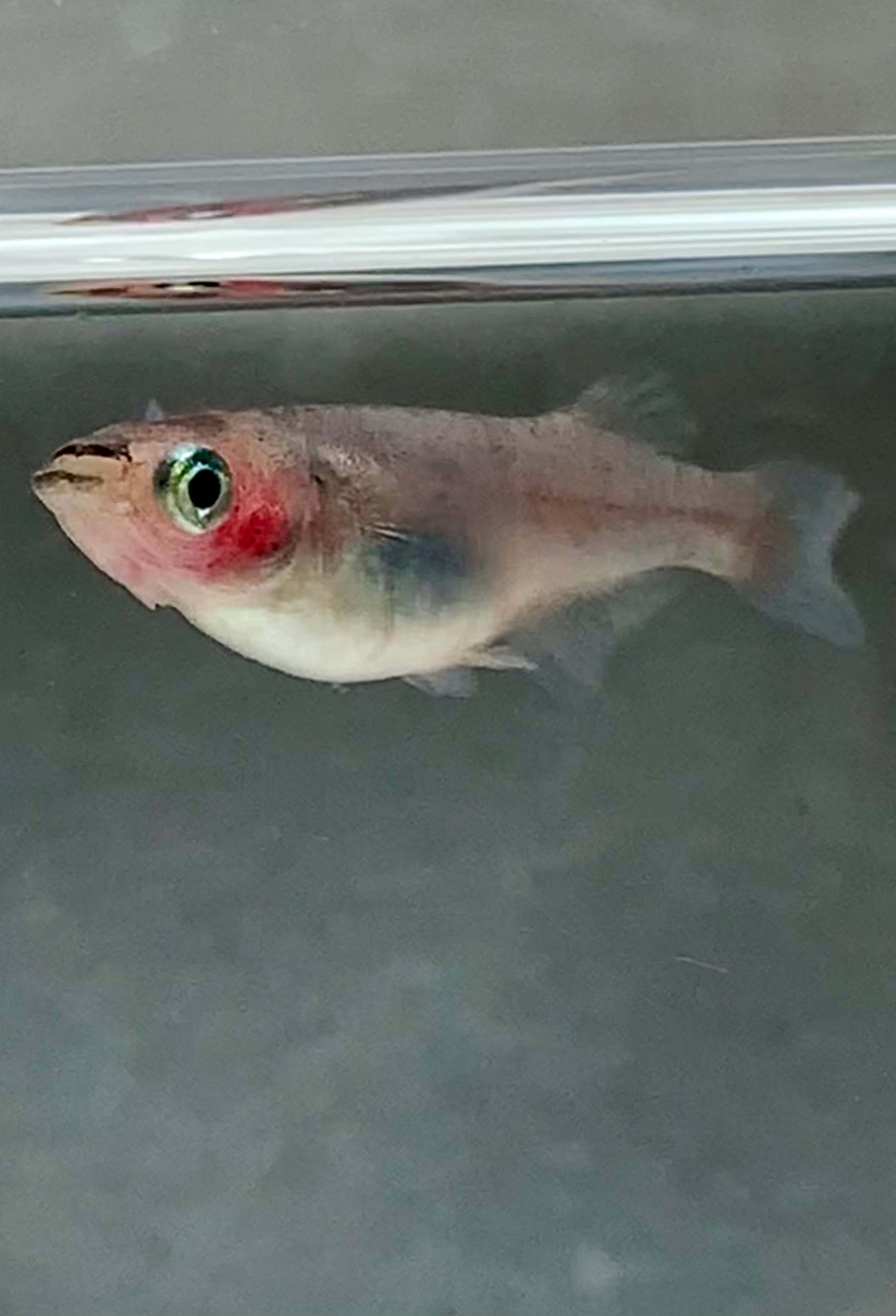 落ち着いた黒い体色に可愛らしい朱色の頬が映え、そのコントラストが目をひく魅力的なメダカです。