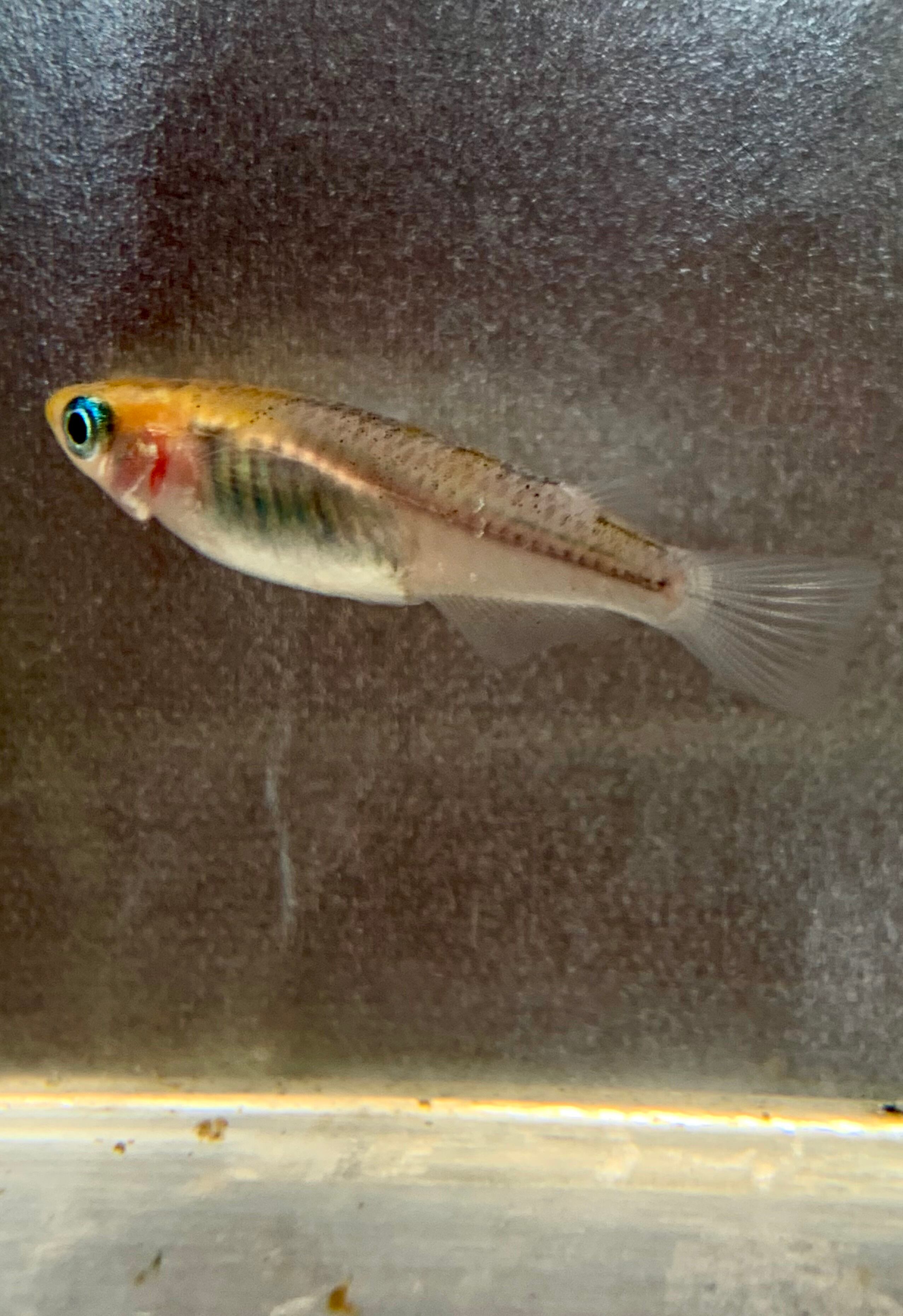 灰黒体色のところどころに橙色や黄色が乗るオーロラメダカです。