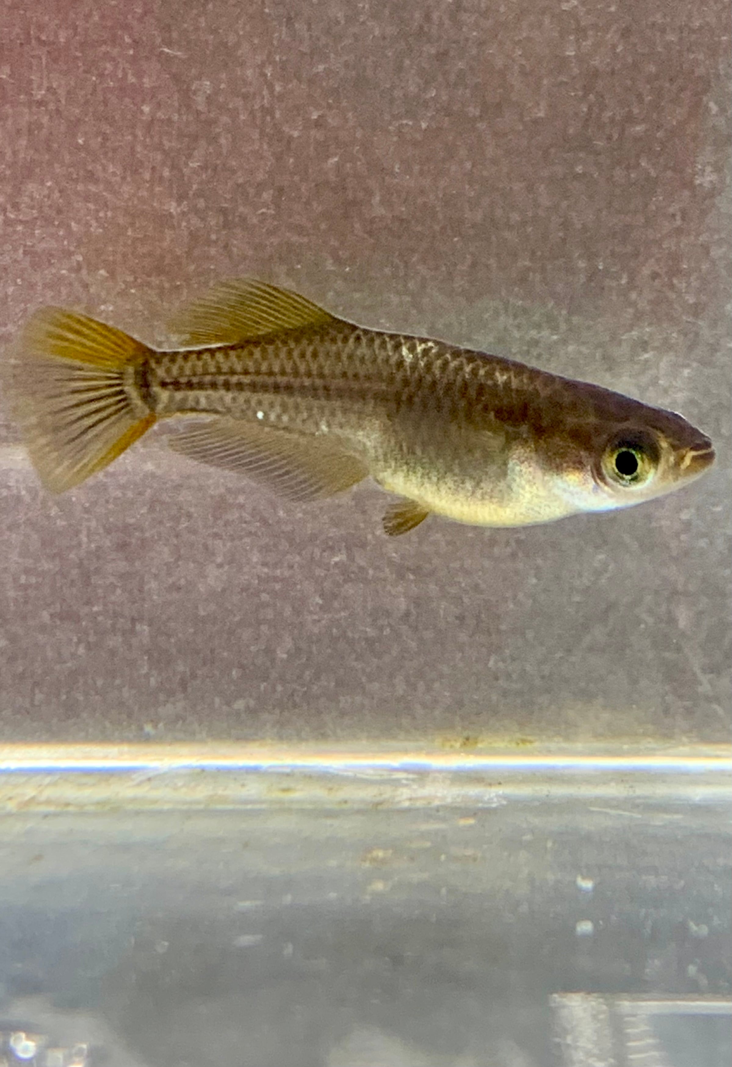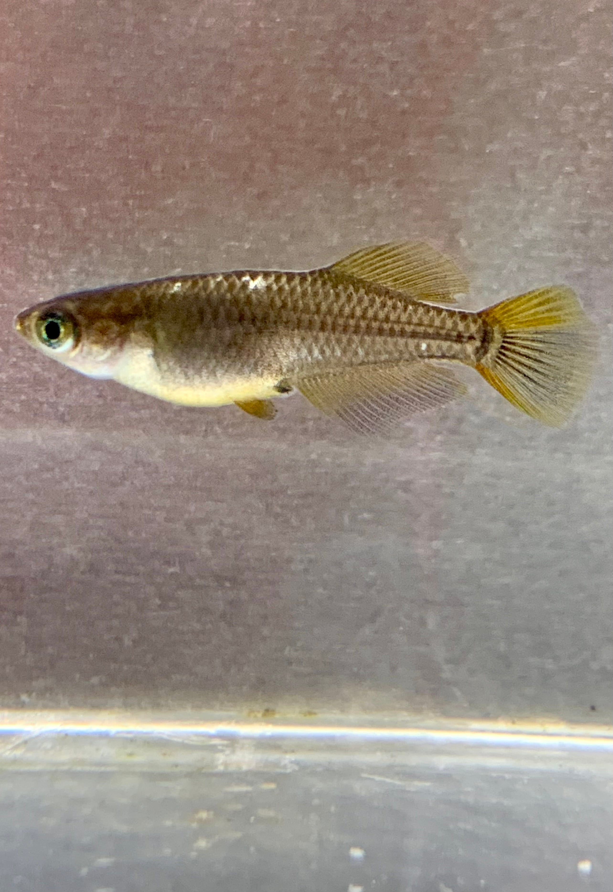 その深みのある茶黒体色が落ち着いた雰囲気を醸し出し、特徴的なヒカリ体形が洗練されたスタイリッシュな印象を与え、黄金色に染まるヒレが上品さを演出します。