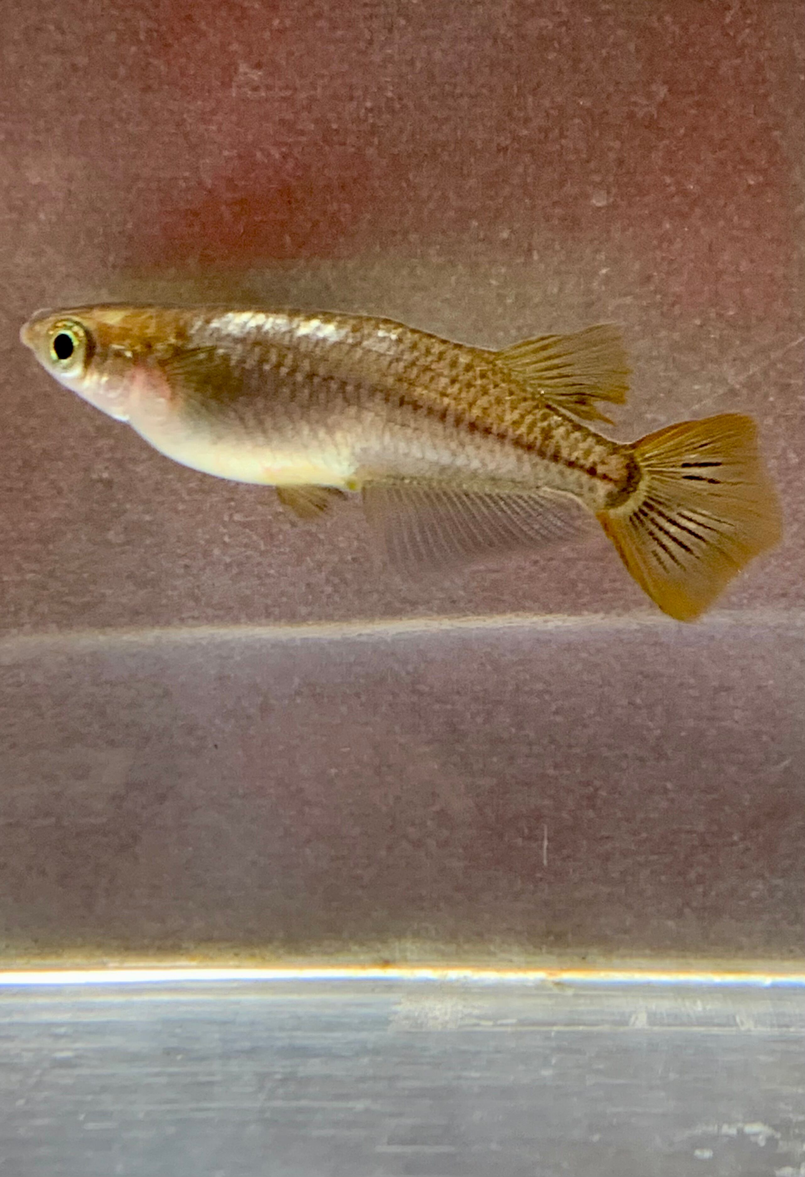 他のメダカと一線を画する体形には新鮮な魅力があり、茶黒体色と黄金色のヒレが織りなす渋い色合いが、高級感を演出しています。