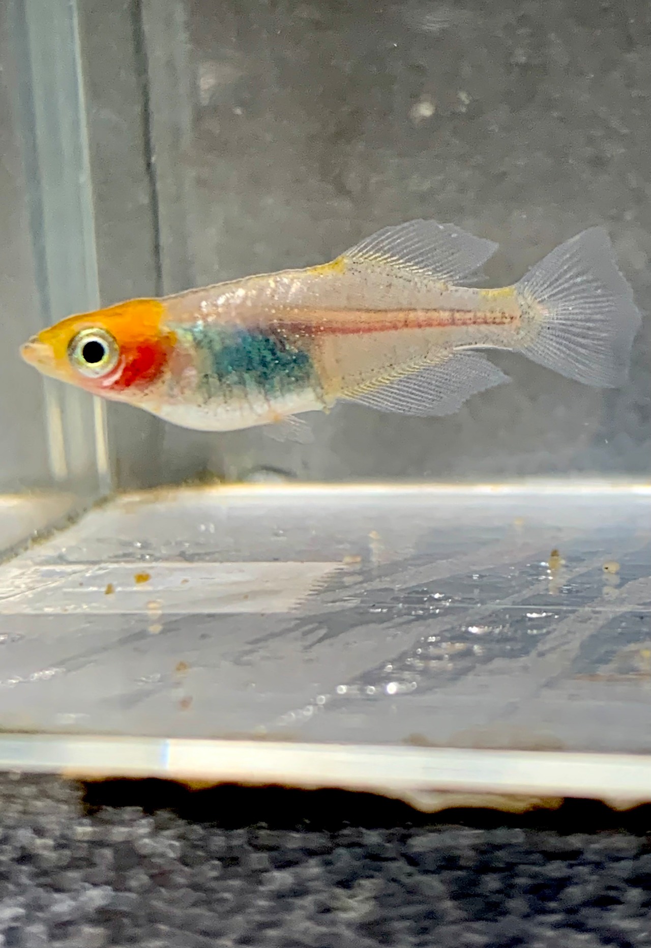 透明鱗の遺伝により朱色に染まる頬や、鮮やかに色づく体色とヒレが特徴で、俊敏さを感じさせるヒカリ体形ボディーがスタイリッシュな印象を与えます。