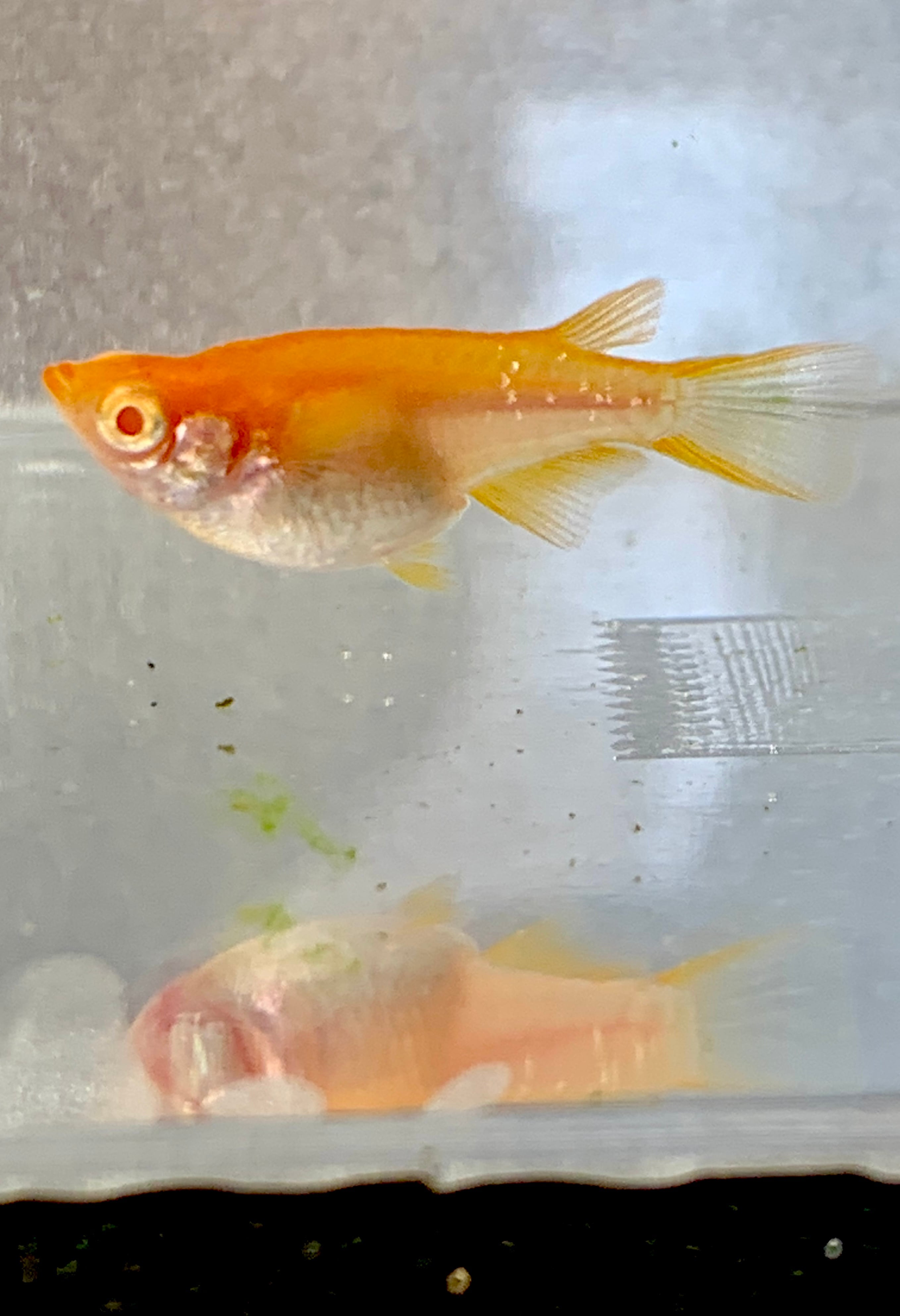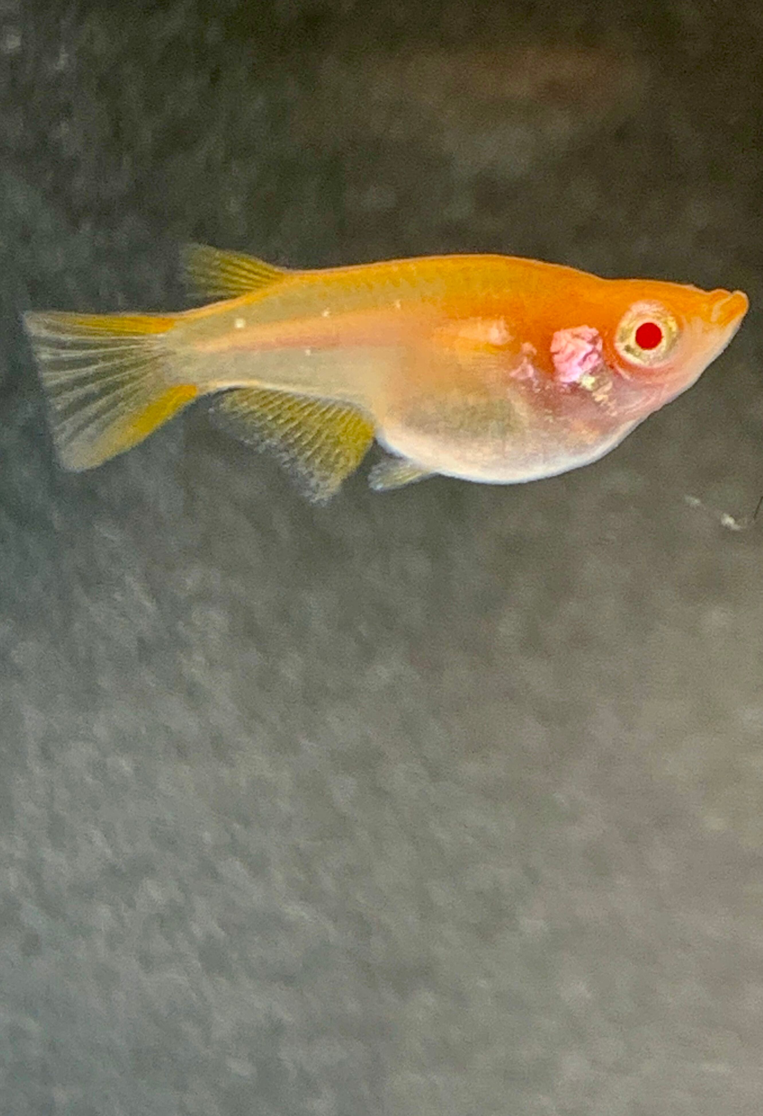 緋赤アルビノメダカのダルマ体形です。