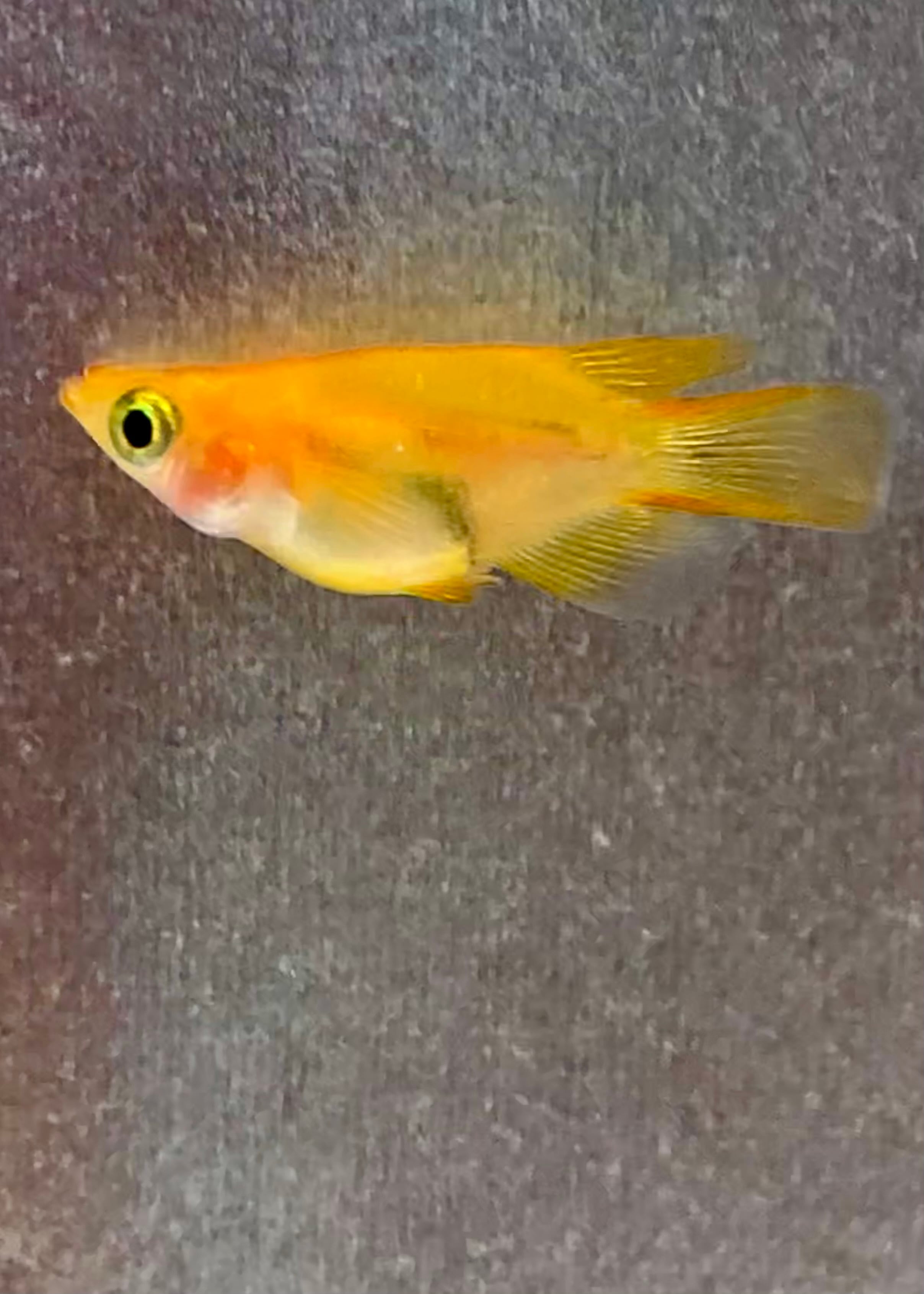 透明感ある飴色の体色(ゴールド)と、ところどころの鱗片が黒く縁取られるブラックリムが特徴のダルマメダカです。