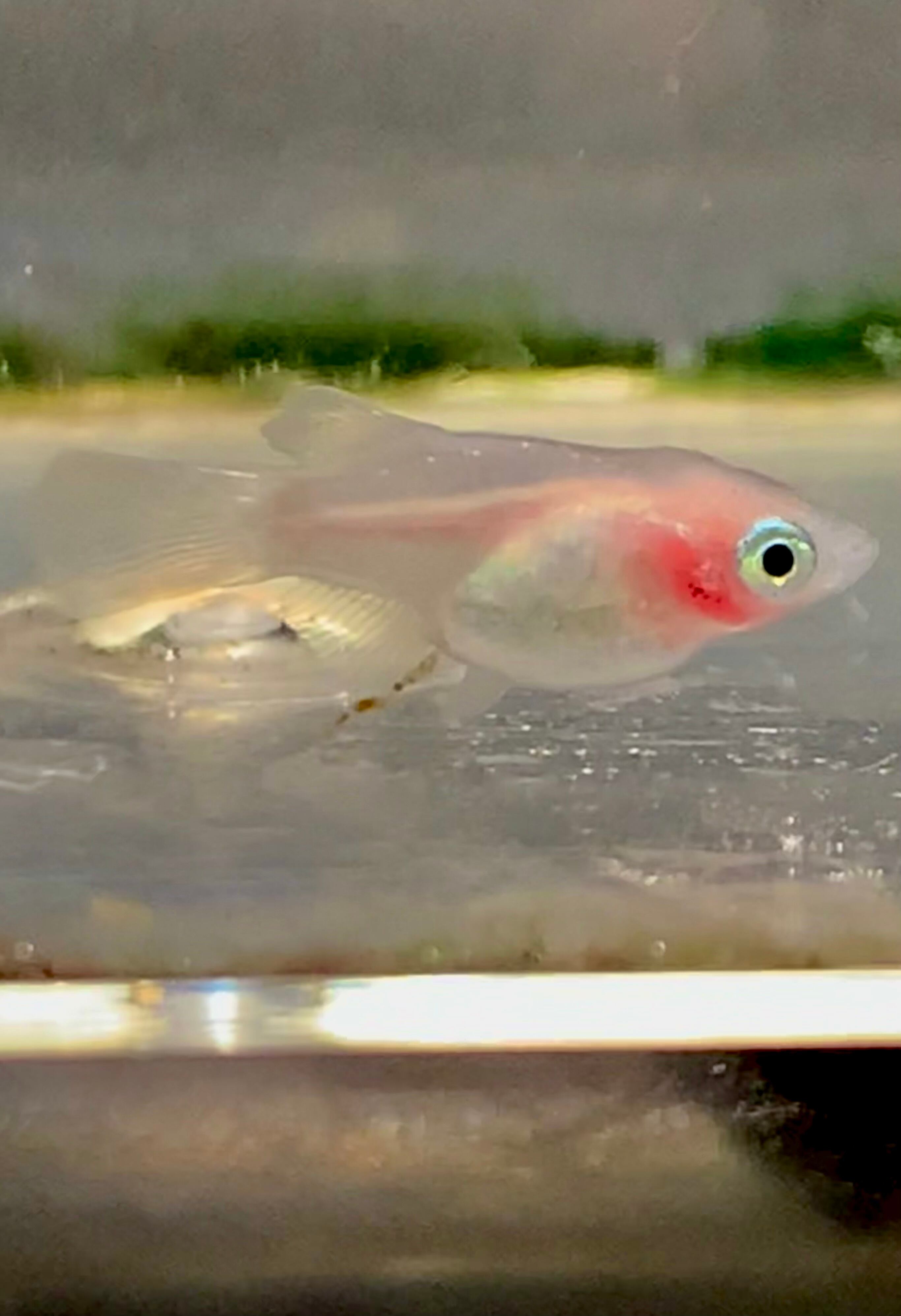 純白のヒカリ体形ボディーに頬の鮮やかな朱色が映え、水槽の中でコロコロとした泳ぎ方を見せてくれます。