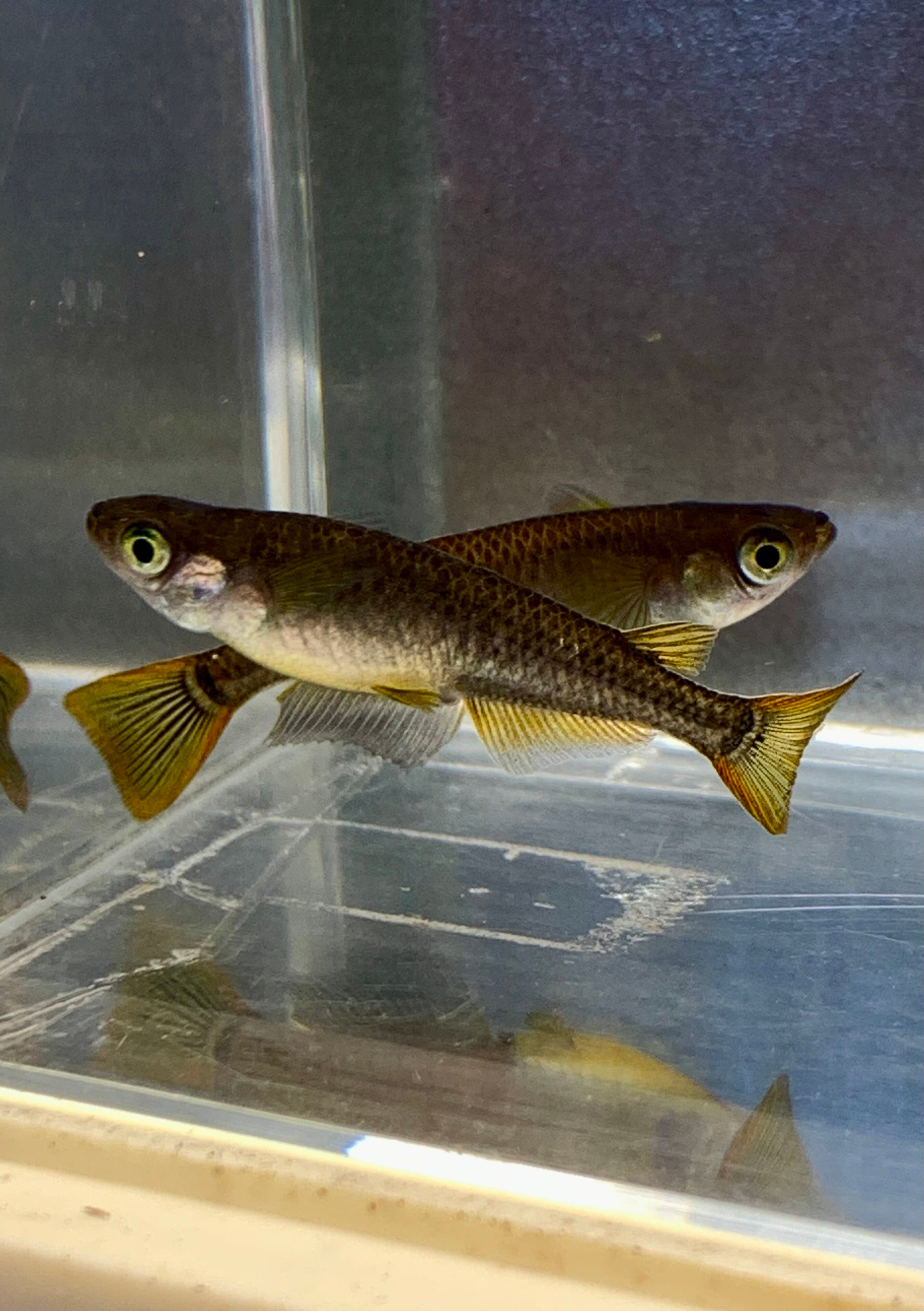 パッと見は普通体形のブラック黄金メダカのようですが、ヒレ長(スワロー)とスモールアイの遺伝を併せ持っています。