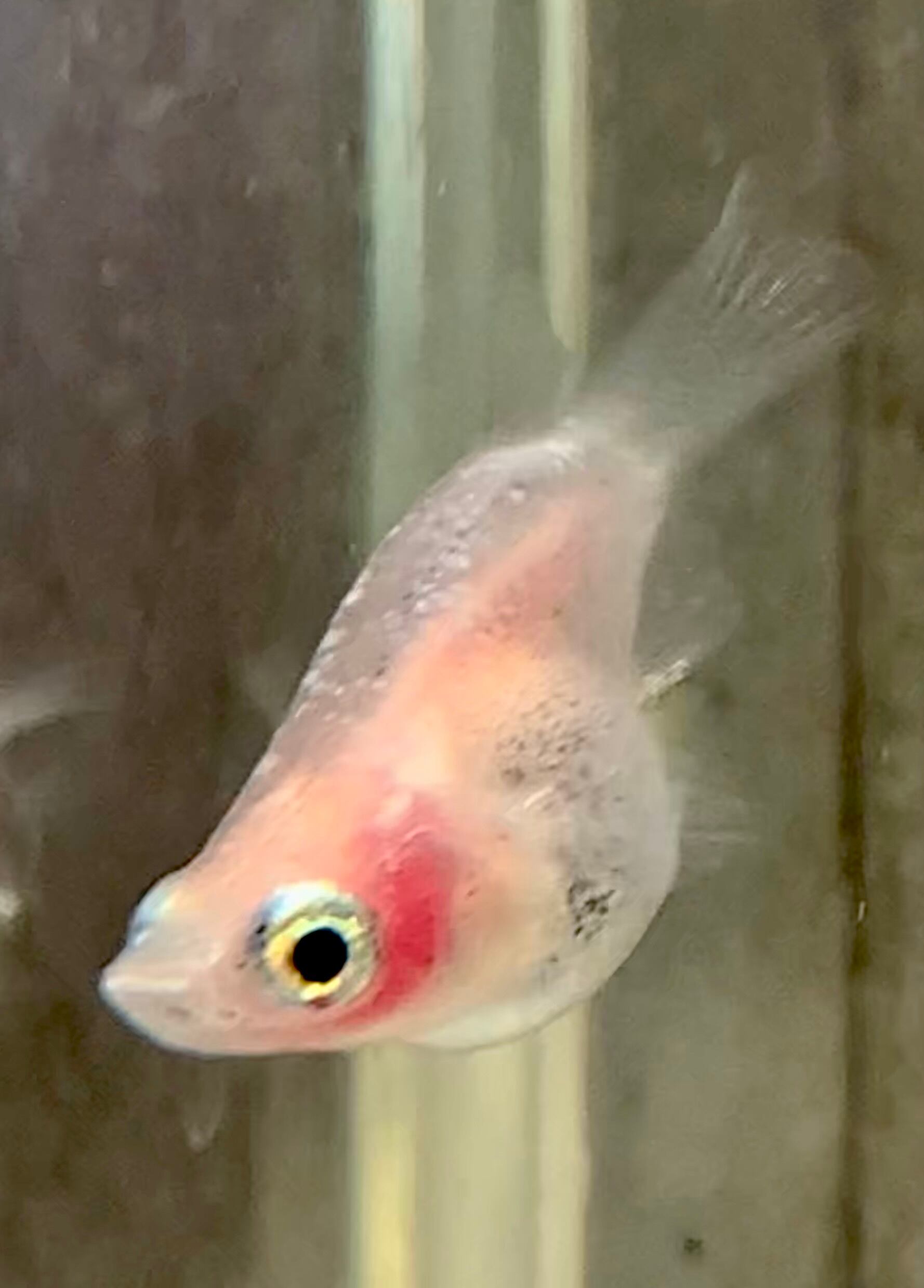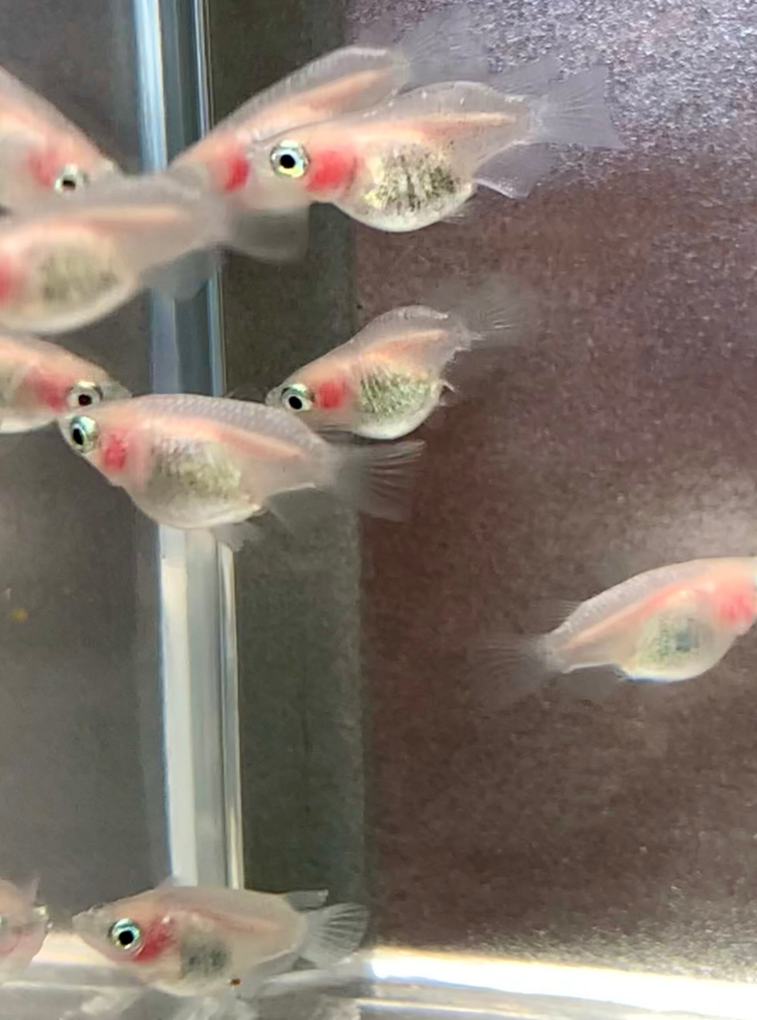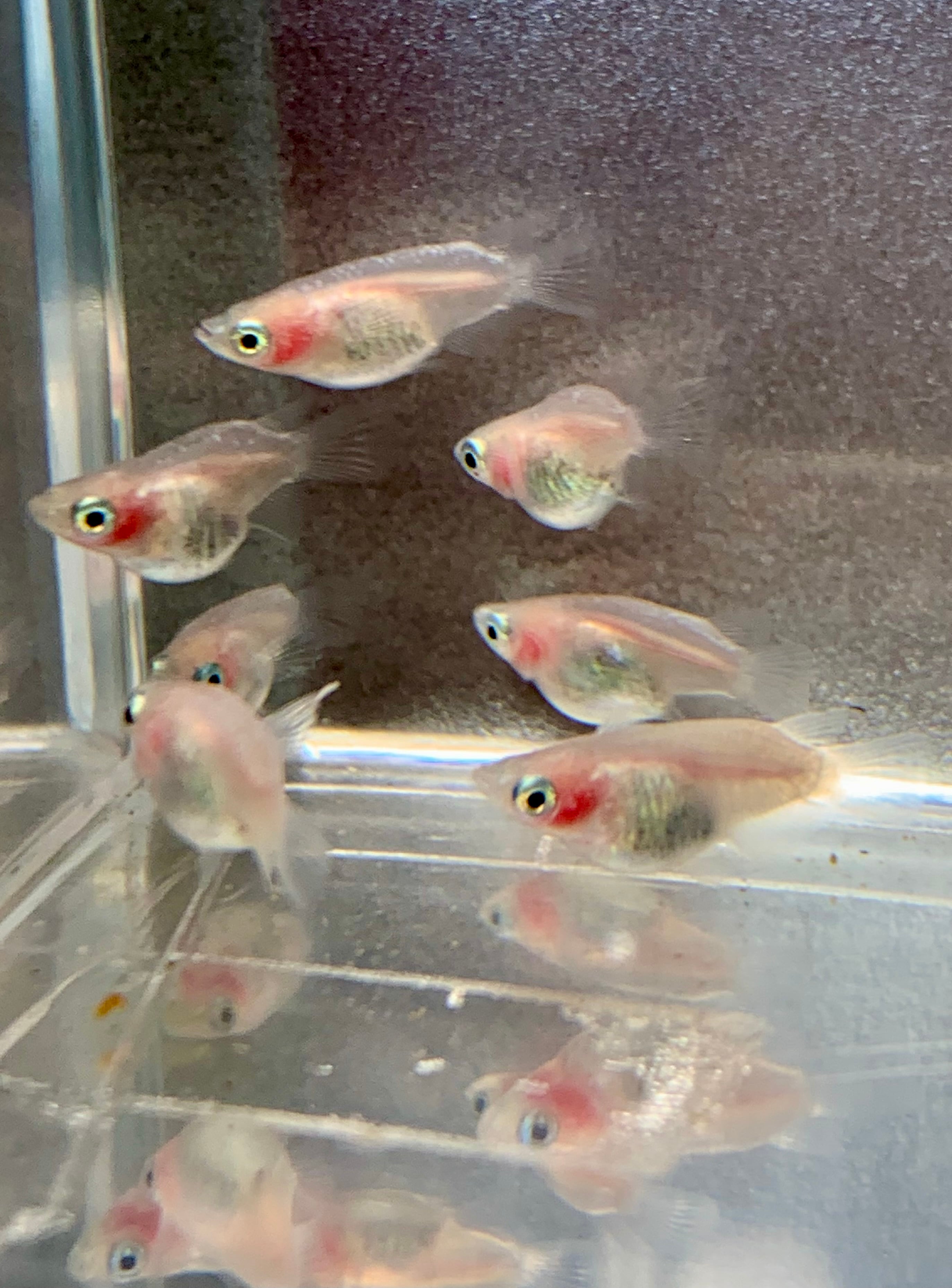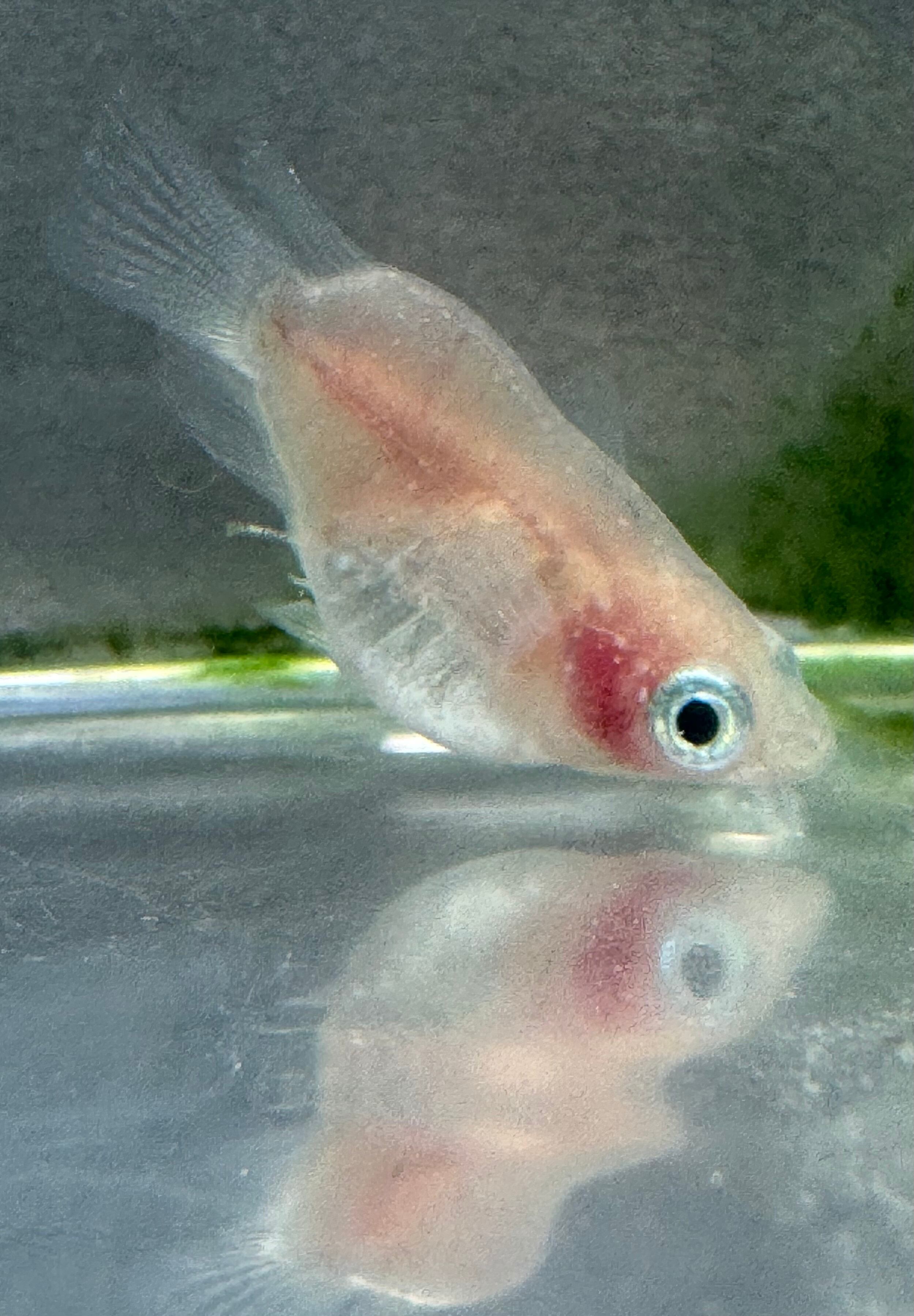 清澄な白い体に鮮やかな赤い頬っぺが映え、水槽を華やかに彩ってくれる白透明鱗メダカ。