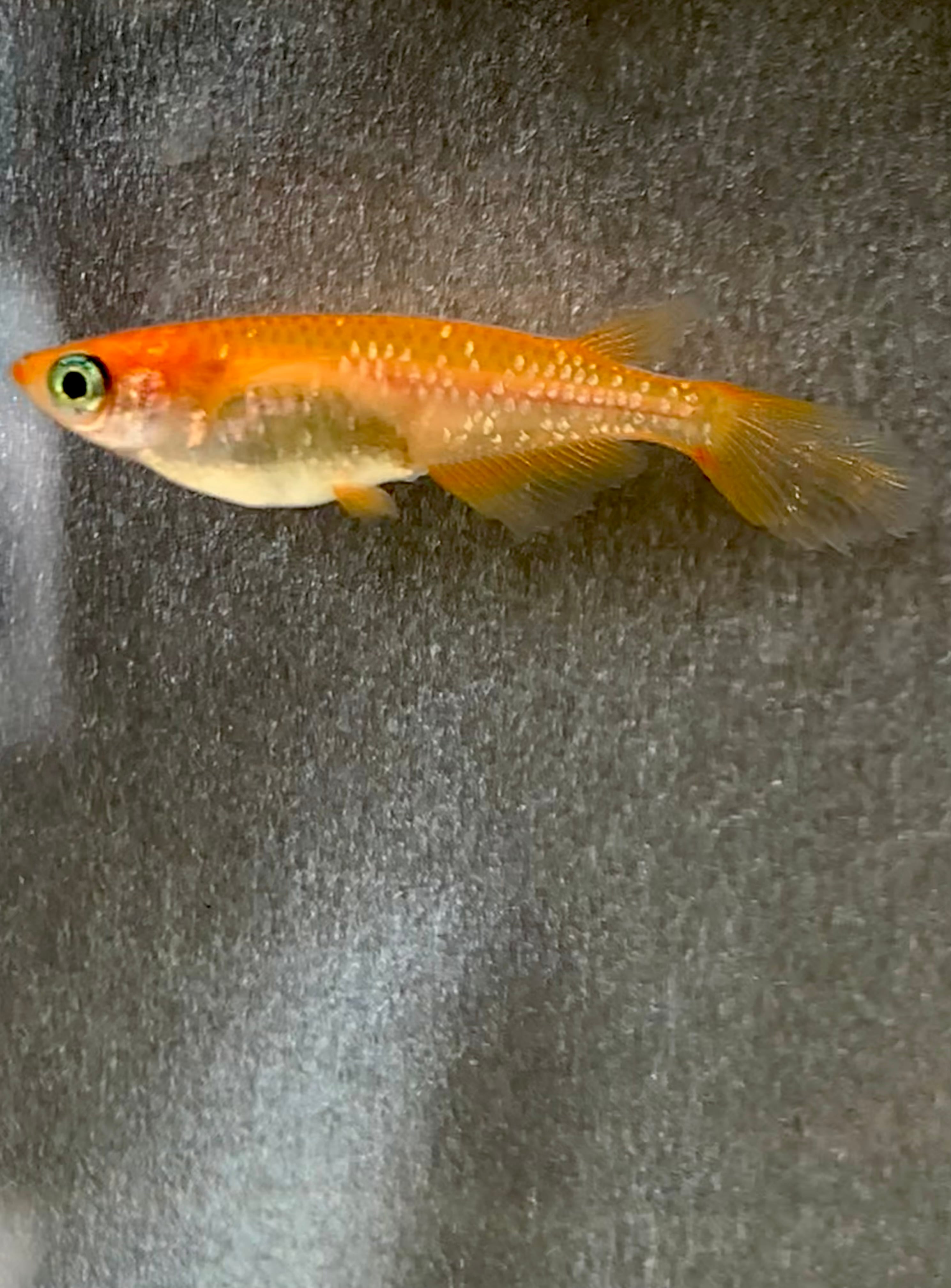 鮮やかなオレンジ体色にキラキラと美しいラメが輝き、ヒレはヒラヒラとしなやかに波打ちます。