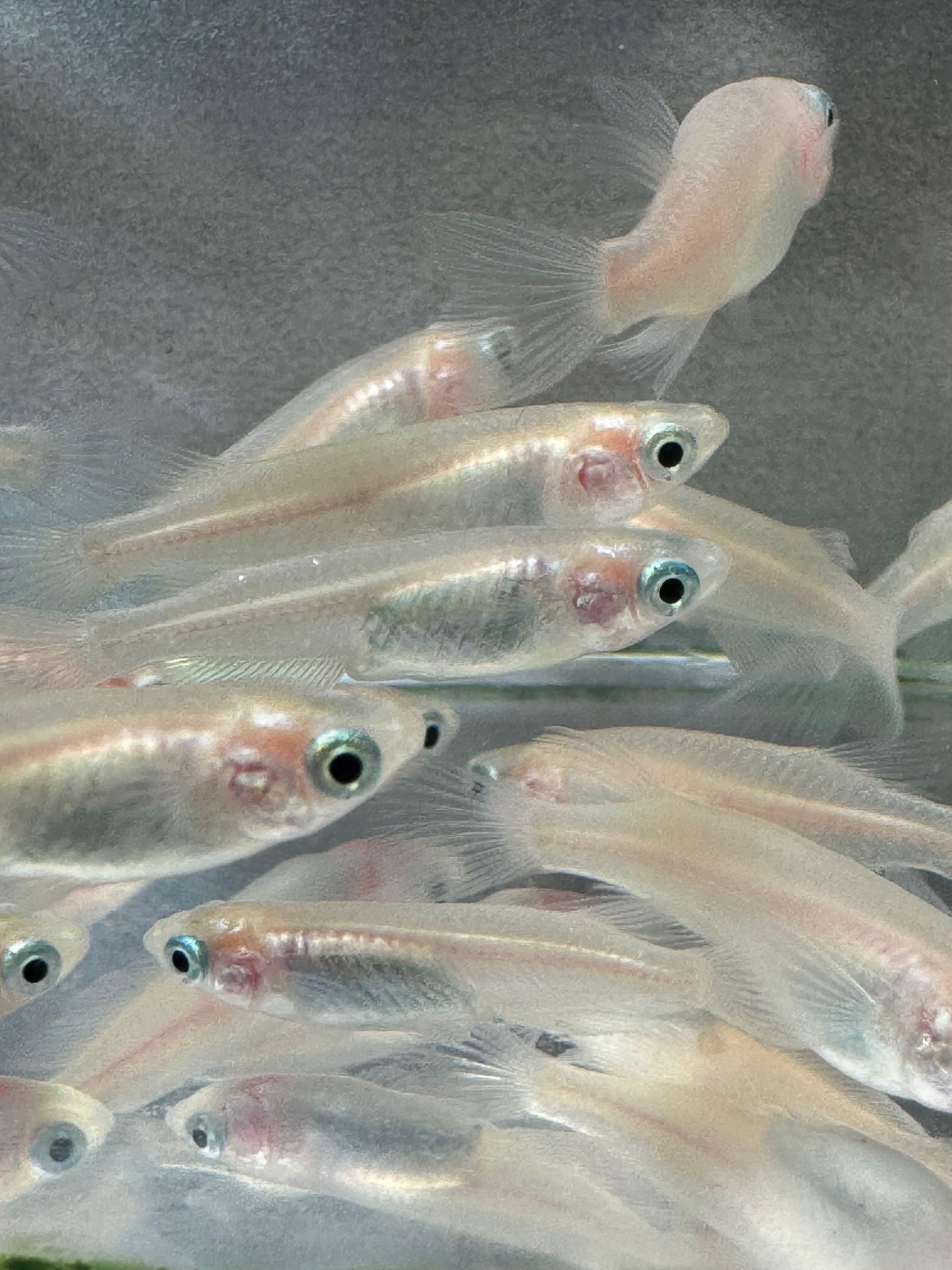 ※2003年に広島『めだかの館』の大場幸雄氏が作出された、オスメスともに黄色素胞のない純白のメダカで、改良メダカの基本的体色の1つです。