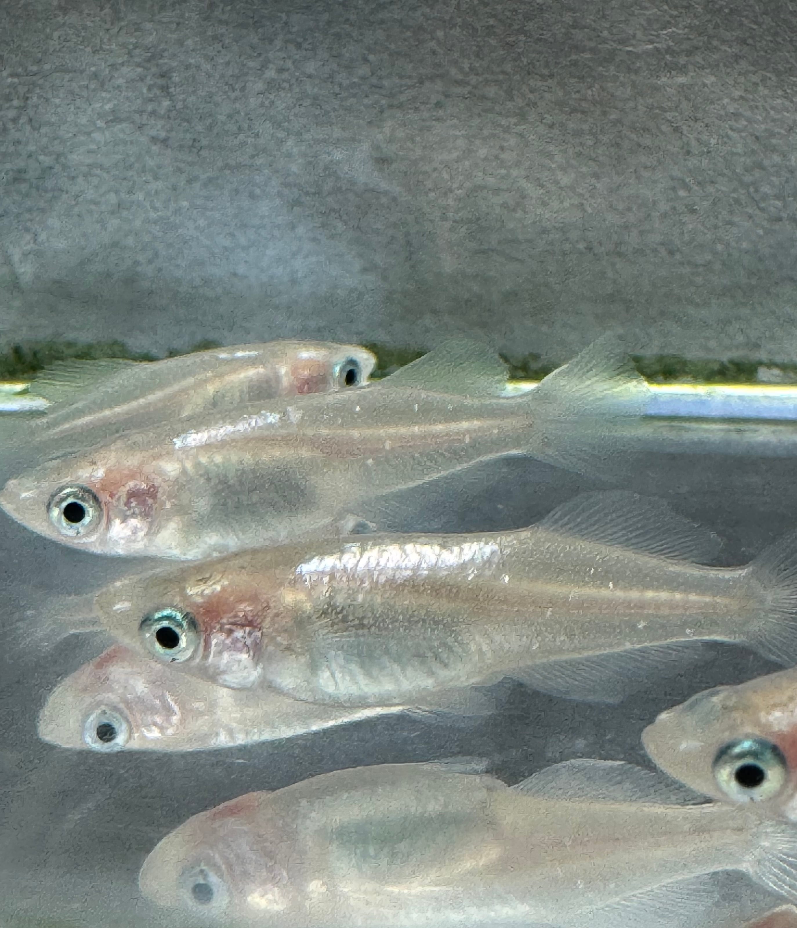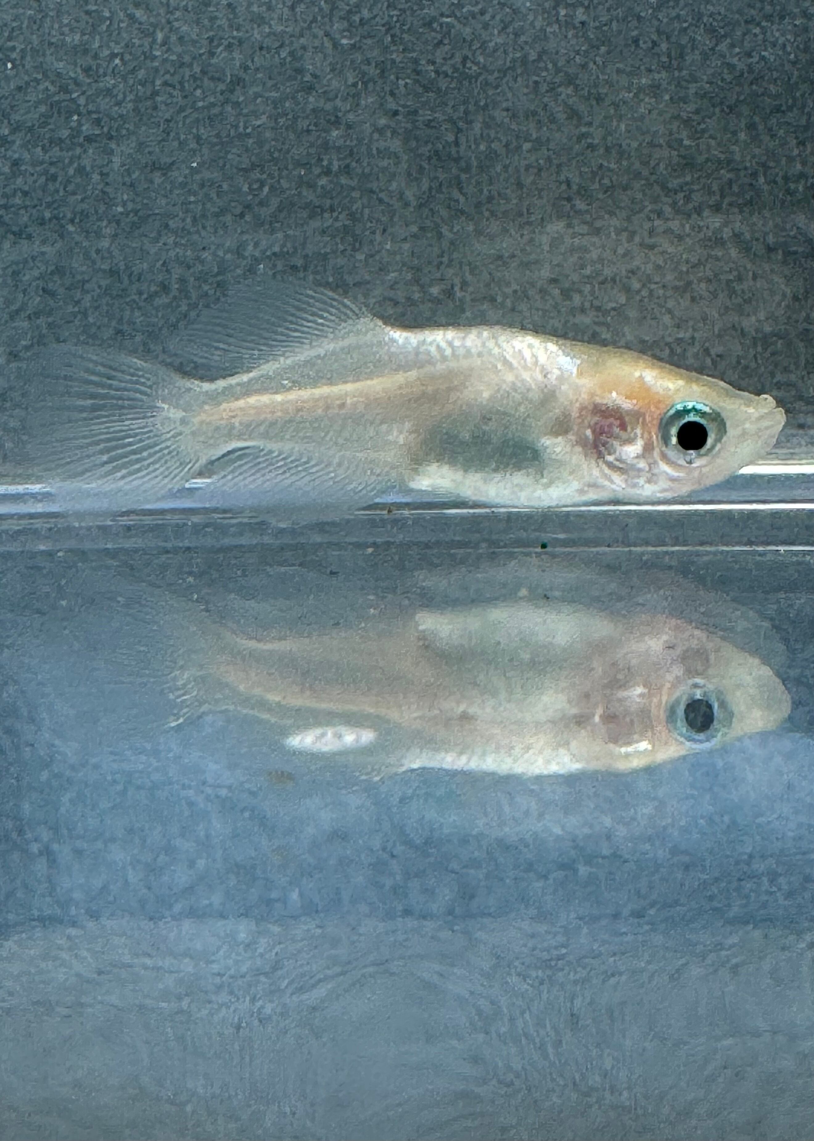 ※2003年に広島"めだかの館"の大場氏が作出された、オスメスともに黄色素胞のない白体色のヒカリ体形メダカです。