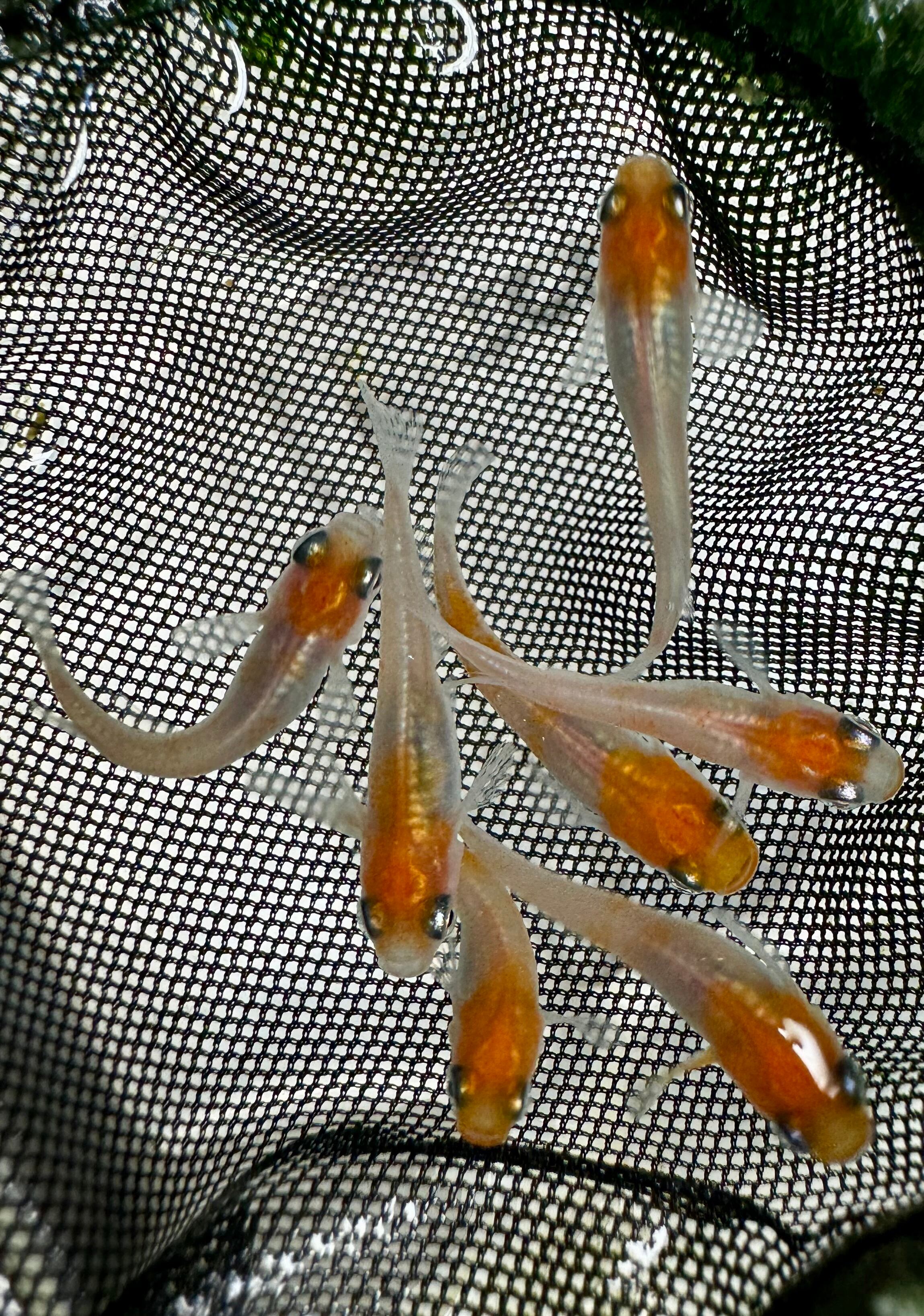 小町特有の際立つ白地に頭頂部の朱赤のコントラストがとても美しいメダカ。