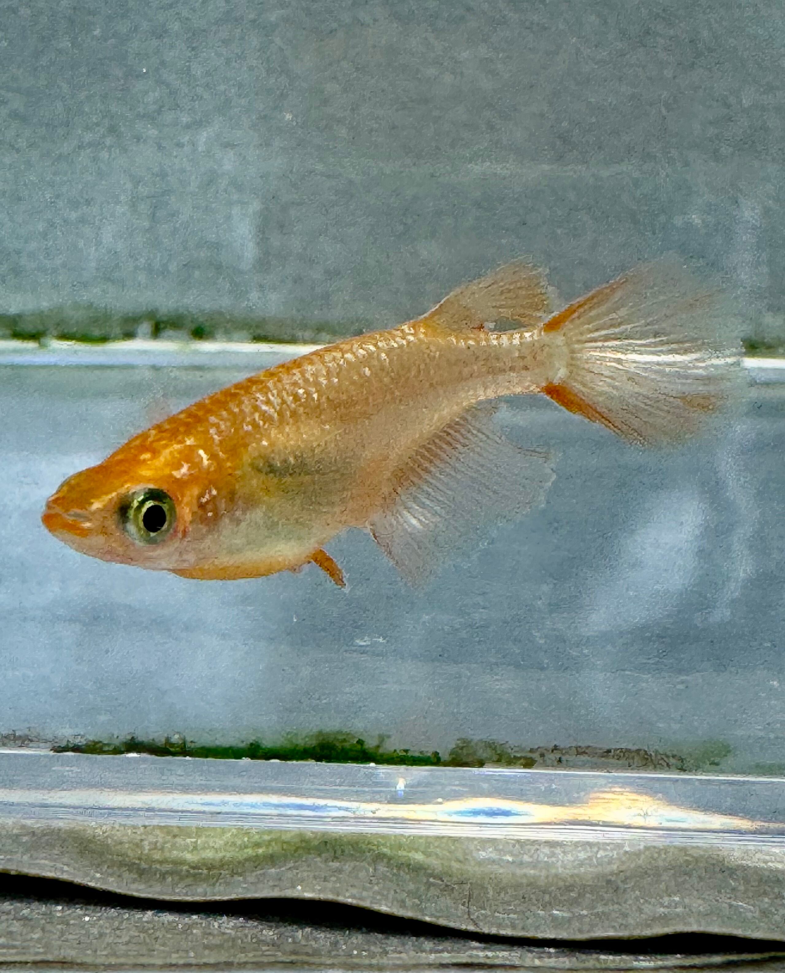 黄体色のオーロラ系メダカで、上見のラメが特に強く、横見ではラメと黄色がしっかり入ったヒレ長の優雅なヒレが特徴です。